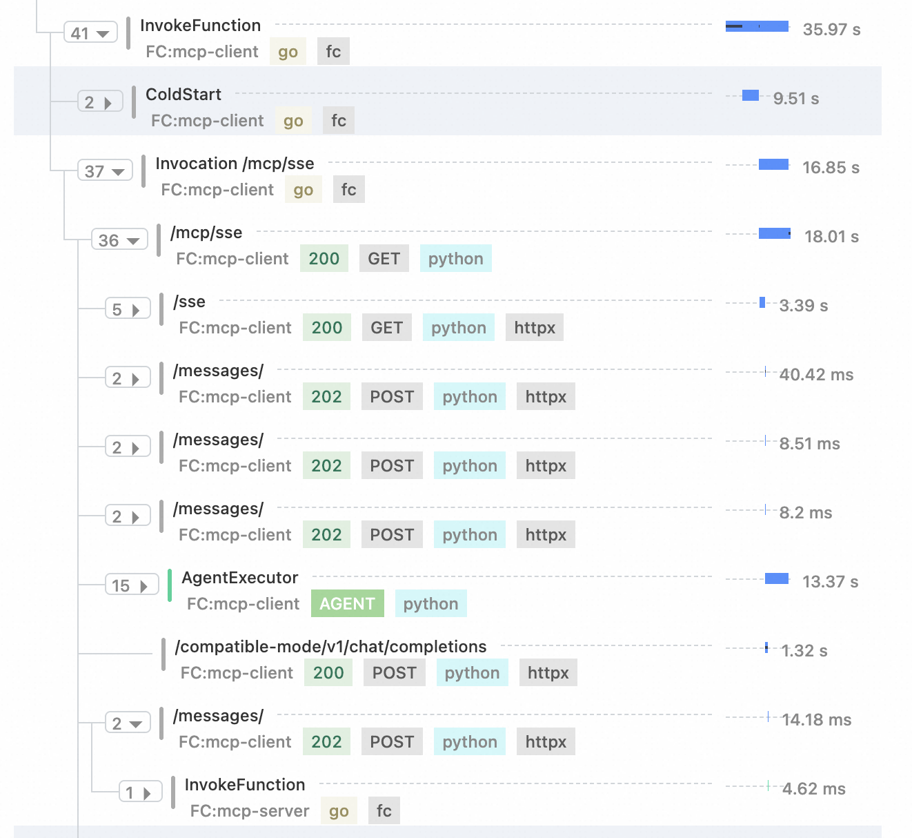 函数计算集成链路追踪后,可以快速定位 Serverless 场景下的性能瓶颈。以一个 langchain 作为 mcp-client 端,高德天气查询作为 mcp-server 端为例。一次查询天气的调用链路如下:可以清晰的看到冷启动信息、sse 连接,message 连接,以及 Agent 的调用信息。