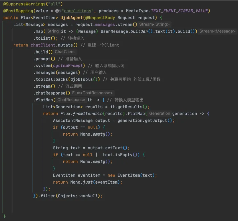从大模型的工程化、实用化角度来说,当你厘清 Spring-AI 这一套 API 设施的逻辑后,事情最后还是会回归到业务开发人最熟悉的 CRUD 领域。就像使用 Mybatis 操作 MySQL 一样,我们会用 spring-ai 来操作大模型。