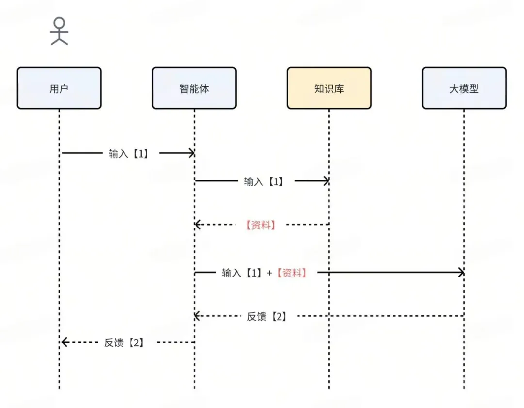 用户提交一个【输入】后,先使用 用户【输入】作为搜索条件,去【知识库】中搜索得到相关的【资料】。