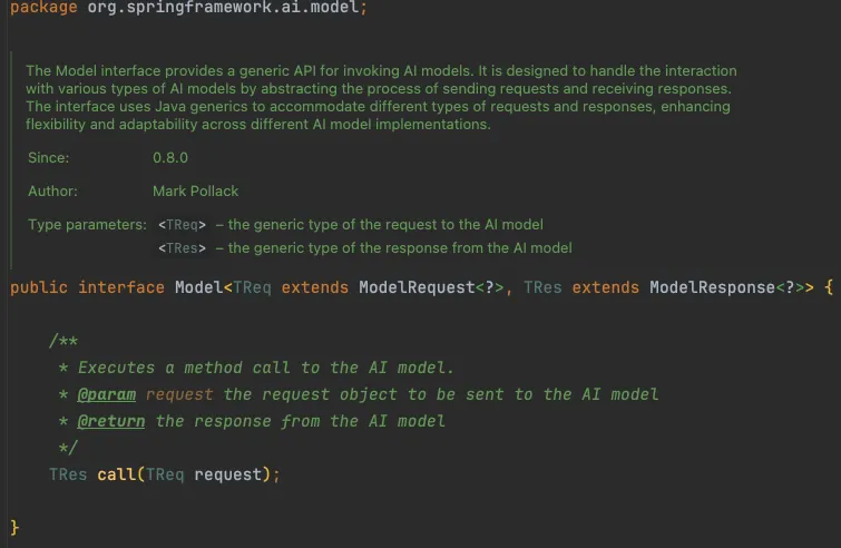 核心的 API 实体是 Model ,是一个带泛型的纯函数,提供了对大模型能力的顶层抽象: