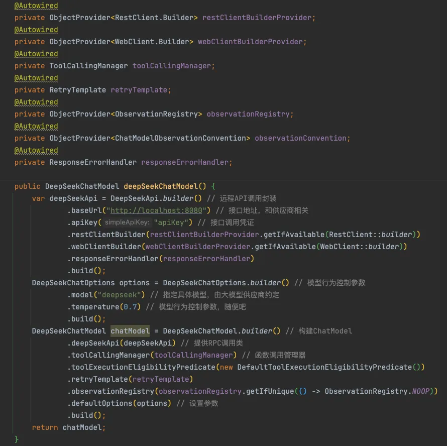 spring-ai 提供了不同平台、不同模型的 API 集成,开发者只需要提供接口地址、调用凭证即可开箱使用~