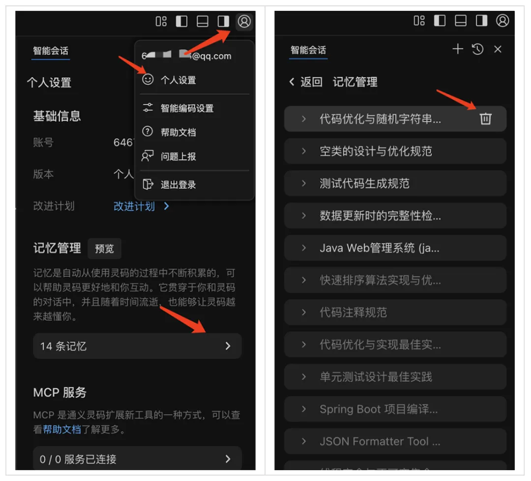 通义灵码提供了长期记忆能力,在开发者与通义灵码的对话过程,会逐渐形成针对开发者个人、工程、问题等相关的丰富记忆,并自动进行相关的记忆整理和更新。