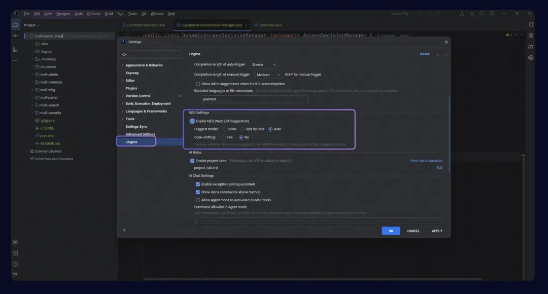 在 IDE 中选择 Settings > Lingma,在 NES Settings 中启用 Enable NES(Next Edit Suggestion)。该功能默认处于关闭状态;启用后,推荐方式默认为 Auto,Code Shifting 配置项默认为 No。