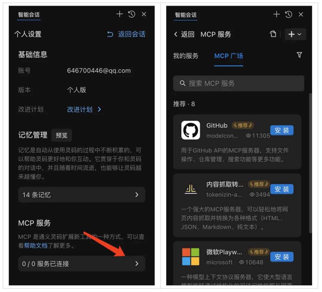 通义灵码现在已经全面支持 Qwen3,并支持智能体模式,具备自主决策、环境感知、工具使用等能力,可以根据开发者的编码诉求,使用工程检索、文件编辑、终端等工具,可以端到端地完成编码任务。同时,支持开发者配置 MCP 工具,编码更加贴合开发者工作流程。
