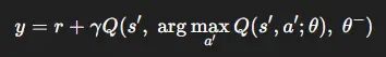 每个episode里循环执行:用ε-greedy策略从在线网络选动作,执行后观察奖励r和新状态s′,把这条经验存进池子。然后从池里随机采样一批数据,用DDQN规则算目标值,对下面这个损失做梯度下降: