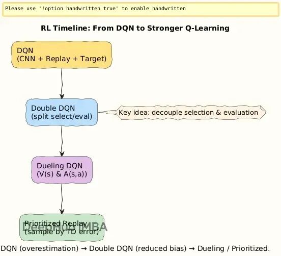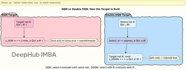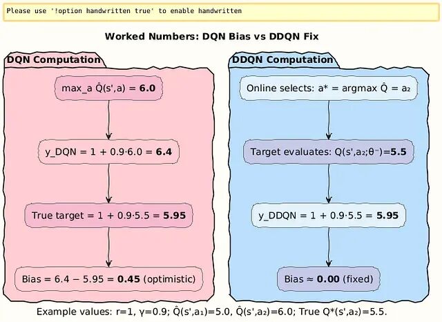 DQN的过估计源于max操作符偏好噪声中的高值。Double DQN把动作选择(在线网络θ)和价值评估(目标网络θ^−)分开处理,让目标值更接近真实情况,稳定性和性能都得到改善。前面两个数值例子清楚展示了偏差是如何被消除的。