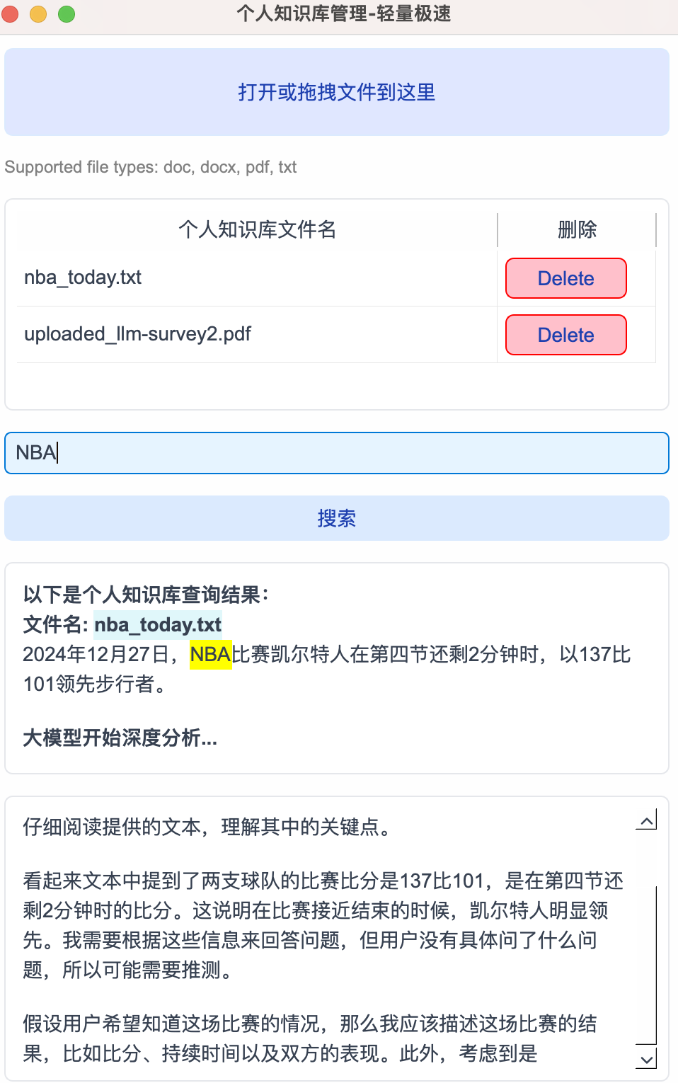 这周末开发的桌面软件,咱们先看看界面功能:包括文件上传,知识库管理,关键词查询及结果显示,然后大模型深度思考分析(部分截图):