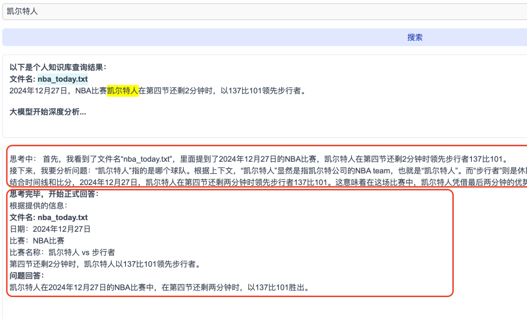 当输入关键词,并点击搜索后,会先从自己的知识库中搜索匹配文件,然后打包命中处的上下文,自动发送到Deepseek-r1:1.5b.