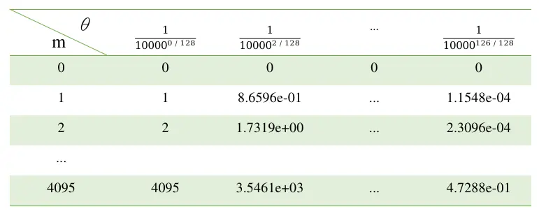 以m=4096,θ=128为例,可以通过m和θ的罗列将这个过程展现出来,每个格子中的结果为m和θ相乘的结果