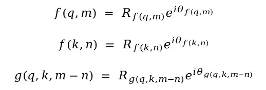 这样改造的目的是使得Attention内积能够自动感知到相对位置信息,即内积可以恒等转化为一个函数,这个函数只和原始的Query,Key,以及两个token之间的距离m-n相关,令g为这个恒等变换函数,则有以下公式