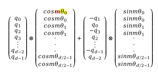 其中第一项代表某个位置为m的token的原始Query向量,0~d-1代表向量每个位置的元素,d代表向量的维度,第二项为一个同样长度是d的带有cos三角函数的向量,它和Query向量逐位相乘,第三项由原始Query变换而来,第四项和第二项类似区别是将cos替换为sin。