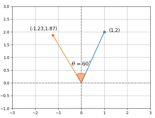 将mθ看作一个参数,将旋转矩阵以函数形式实现,令二维向量坐标为[1, 2],将其旋转60度的numpy实现如下