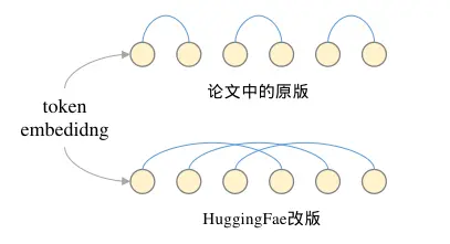 ,交换两者的位置,并且对于偶数位取了相反数,因此每个元素位的注入位置信息的过程,可以看成是该元素和它相邻的元素,分别经过sin,cos三角函数加权求和的结果,比如q0的RoPE结果是q0和q1这一对元素经过三角函数变换的结果。在下文的源码分析中,我们会介绍此处的相邻条件并不是必须的