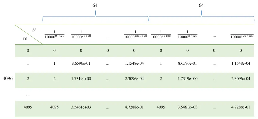 :根据给定的上下文窗口大小作为m,多头下每个头的向量的维度大小作为d,生成cos向量和sin向量,也就是RoPE公式中的第二项和第四项。在LLaMA2中上下文窗口为m=4096,每个头下的向量维度为d=128。