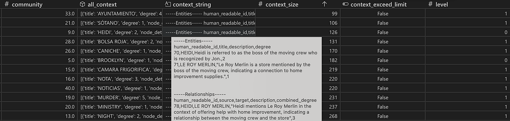 显示报告生成前中间步骤的表格快照。对于每个社区,收集所有实体和关系,然后将其结构化为字符串,作为上下文传递给LLM。context_exceed_limit列在context_string需要缩短时提醒算法。