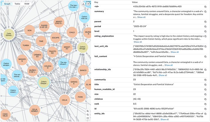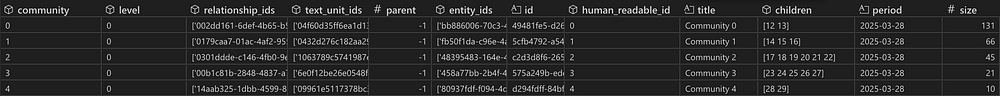 社区表的快照。社区0是级别0社区,使其成为根社区(没有父级)。它有两个子社区,如children列所示。社区封装的所有关系、文本单元和实体都列在相应的列中。size列显示社区由131个实体组成。