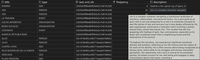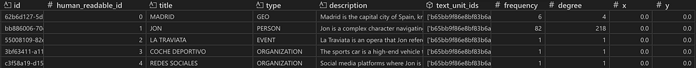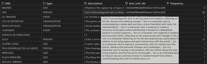 实体表的快照。实体按实体标题和类型分组。实体Jon被提取了82次,这可以从频率列中观察到。text_unit_ids和description列分别包含82个ID和描述的列表,显示了Jon在哪些块中被识别和描述。默认情况下,有四种实体类型(地理、人物、事件和组织)。