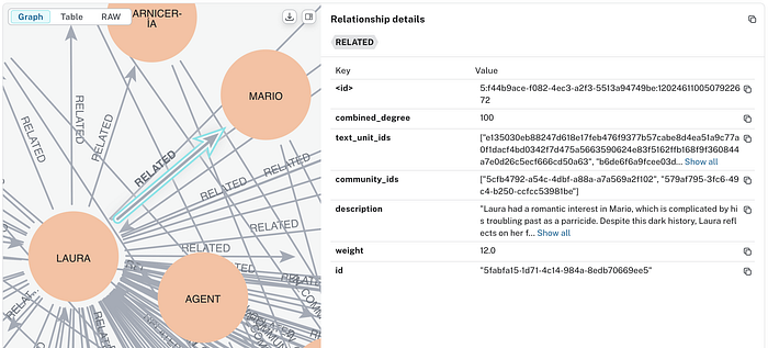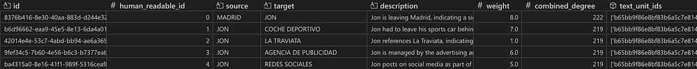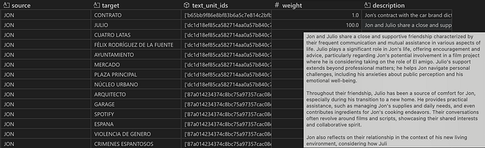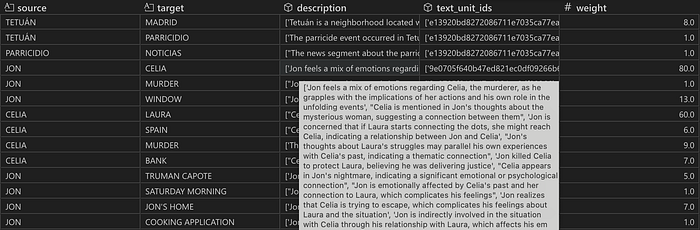关系表的快照。关系按源实体和目标实体分组。对于Jon和Celia,description和text_unit_ids列分别包含14个条目的列表,表明这两个角色在14个不同的文本块中识别出关系。weight列显示了LLM分配的关系强度之和(权重不是源节点和目标节点之间的连接数!)。