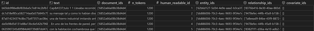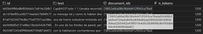 《Penitencia》这本书的前五个块。每个块长1200个token,并有一个唯一的ID。
