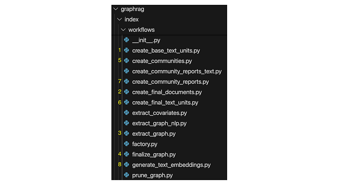 这会触发两个关键操作:从源文档中提取实体和将图划分为社区,这些操作在GraphRAG项目的workflows目录的模块中定义。