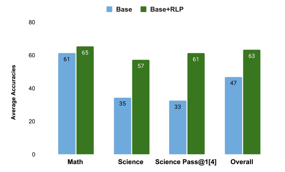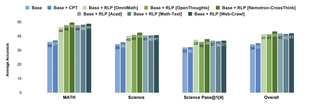 结果显著,RLP 模型的整体性能从 42.81% 跃升到 61.32%,相对提升 35%。最引人注目的是科学推理能力——绝对值提升了 23 个百分点。这意味着用少 2000 亿 token 的训练量,却达到了更好的效果。
