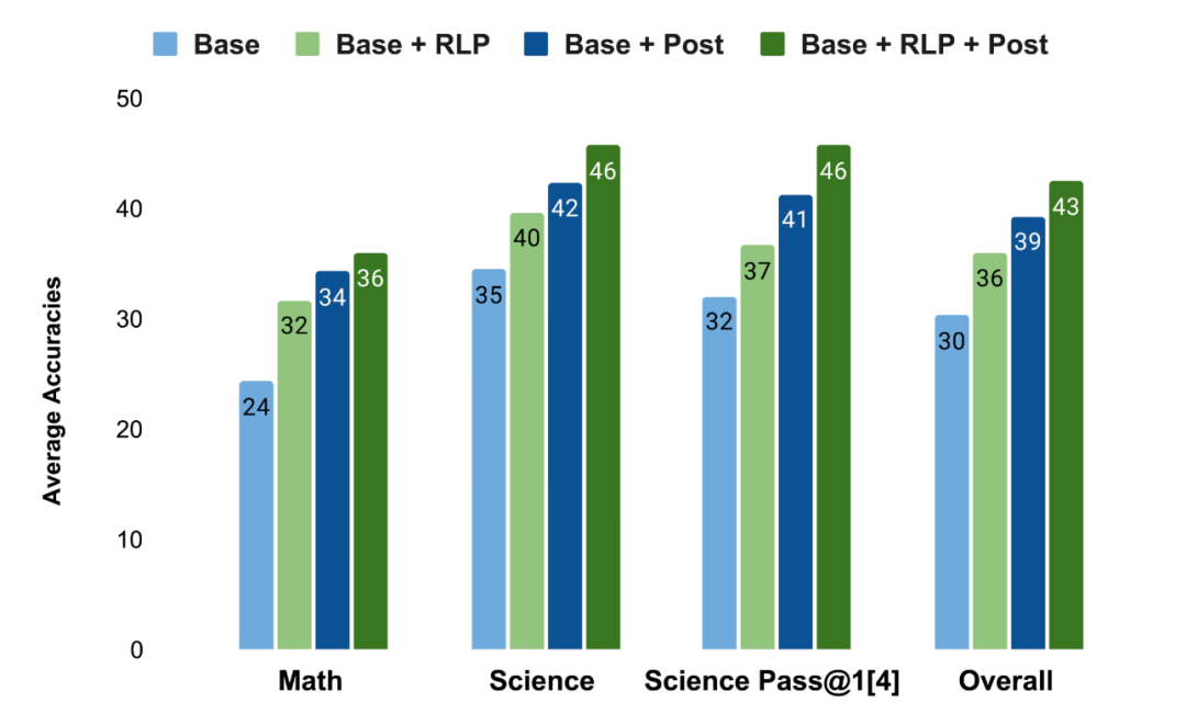 更有意思的是,这种优势在后续的 SFT(监督微调)和 RLVR(强化学习验证奖励)阶段不会消失,反而会叠加——最终保持 7-8% 的相对优势。特别值得注意的是,RLP 的提升不局限于数学领域。在科学推理基准测试中,RLP 模型比 CPT 模型高出 3 个绝对百分点,展现了其多步推理能力的通用性。