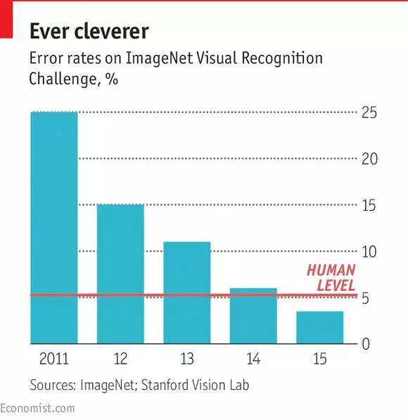在随后的研讨会上,获胜者分享和讨论他们的技术。2010 年,获胜的那个系统标记图像的准确率为 72%(人类平均为 95%)。2012 年,多伦多大学教授杰夫 · 辛顿(Geoff Hinton)领导的一支团队凭借一项名为 “深度学习” 的新技术大幅提高了准确率,达到 85%。后来在 2015 年的 ImageNet Challenge 竞赛中,这项技术使准确率进一步提升至 96%,首次超越人类。