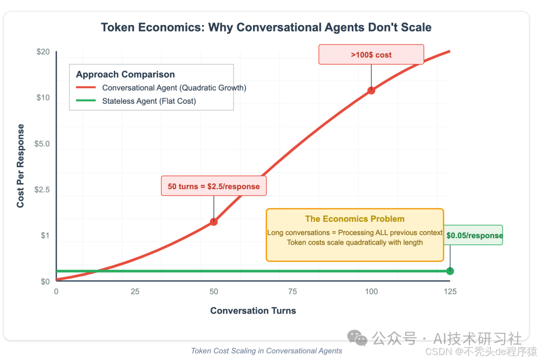 - Token 成本爆炸:长会话 Agent 必须不断传递上下文,成本呈二次方增长。我有个数据库 Agent,前几次查询只要几美分,但到第 50 次,每次就要几美元,完全失去经济性。
