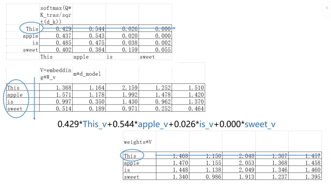 现在我们把这个相关性矩阵和刚刚变换得到的V矩阵相乘,就得到了加成了上下文信息的embedding。为什么要和V矩阵相乘?V矩阵最开始的设定就是“token对外传递的信息”。