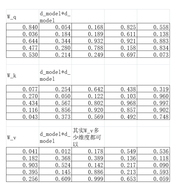 生成拆分head的线性变换,注意维度:为了降维,线性变换矩阵为d_model*d_k维度。