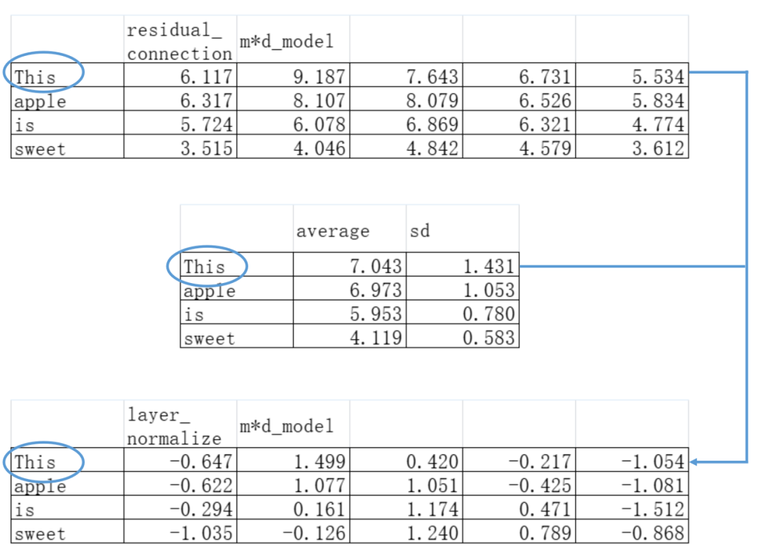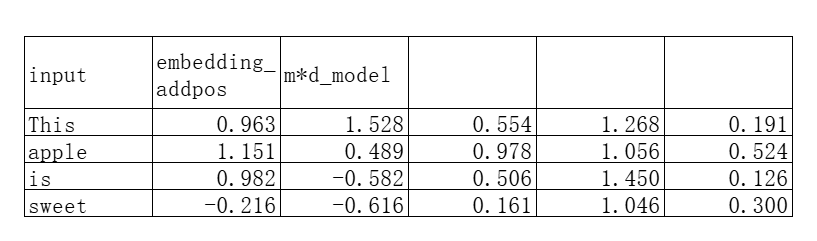 现在说回我们“This apple is sweet”的例子,我们就假设缩放和平移参数分别是1和0(也就是保持normalization后的数据分布不动),我们得到下面的矩阵: