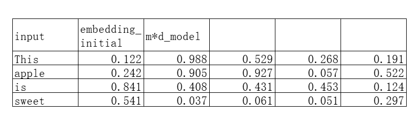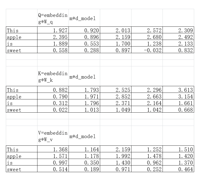 假设这句话就是被按照词语拆成4个token(实际是按照subword来拆token),且每个token都被embedding成了下面的5维向量:
