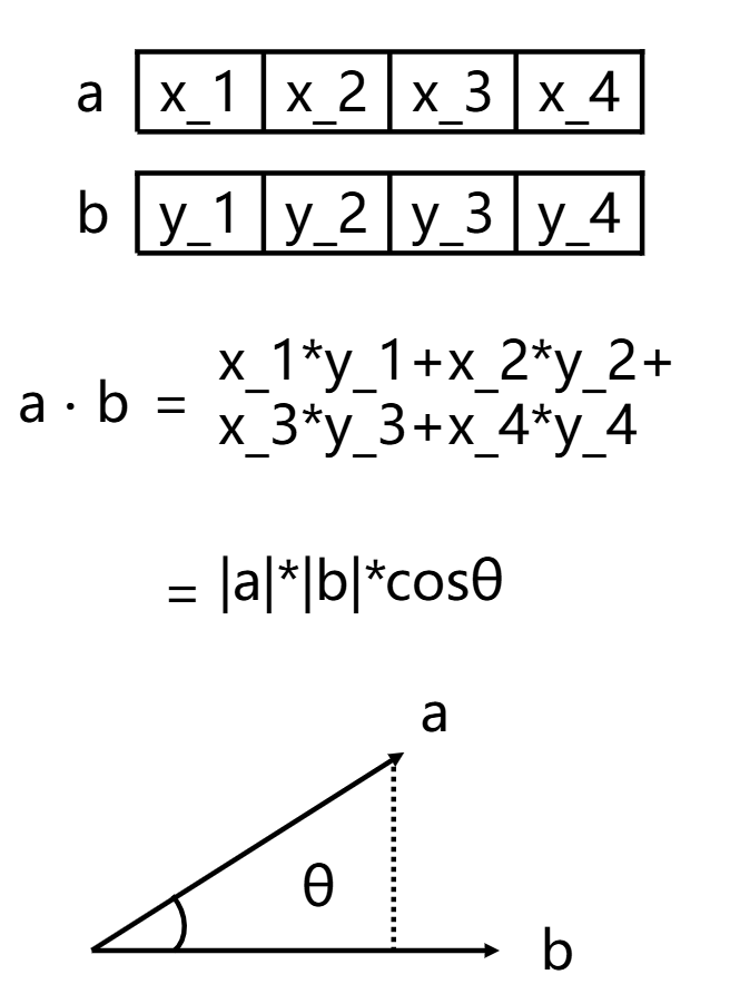 两个向量的点积,就是两个向量每个维度的数值对应相乘再相加。在数值运算上,向量a和b的点积刚好等于向量a的模长乘以向量b的模长再乘以cosθ。这就是向量的点积可以表征向量相似性的原因。