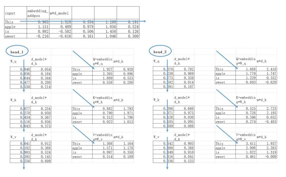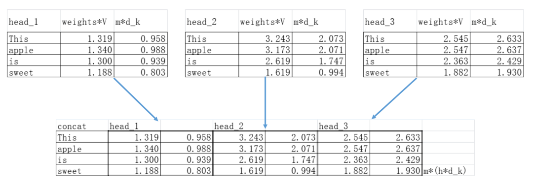 继续拿“This apple is sweet”这个例子来说明,我们假设有3个head(h=3),然后每个token在经过生成head的线性变换之后,从5维变成了2维(d_k=2)。
