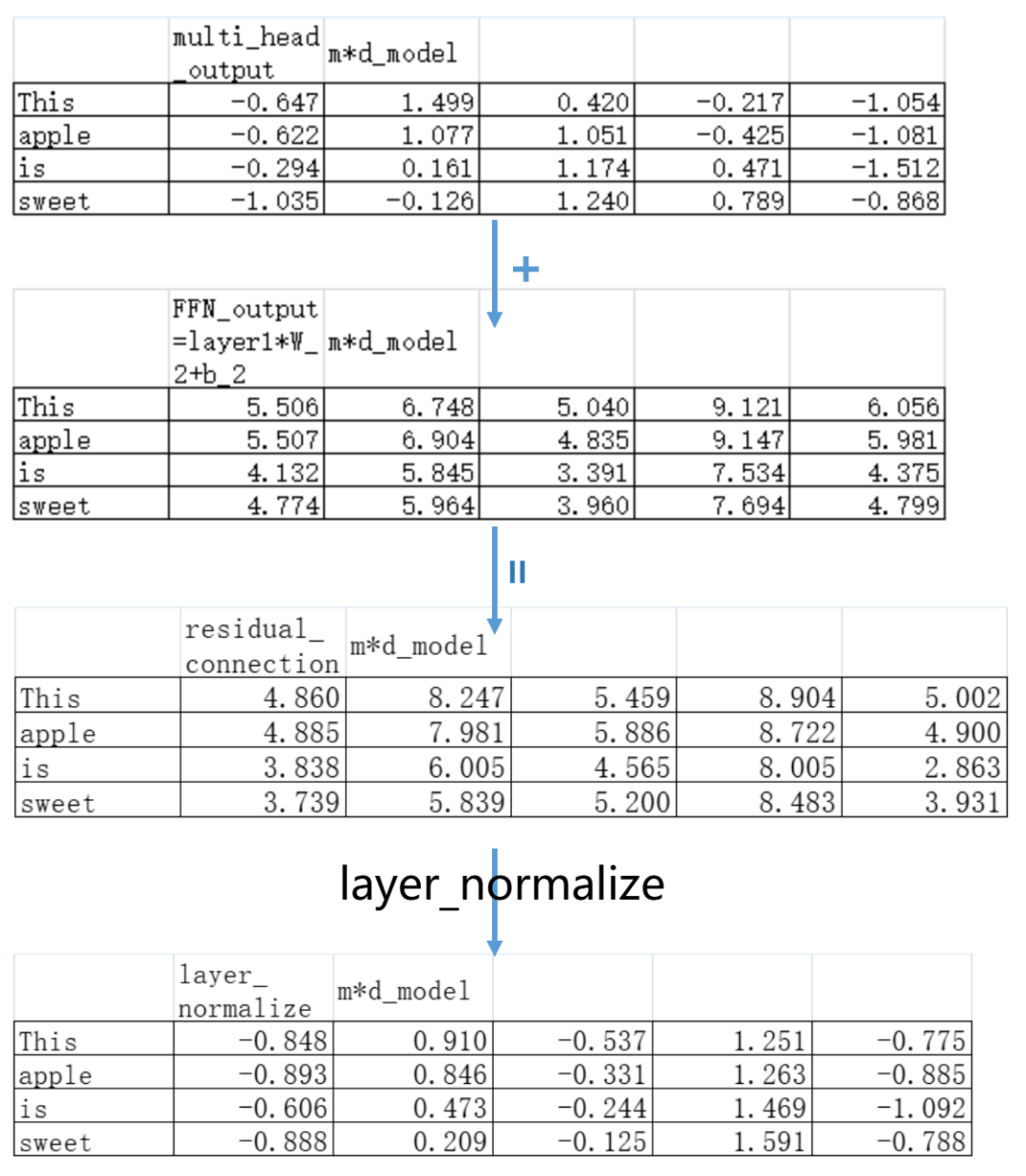 可以看见原本经过Multi-Head Attention变换,再加上残差连接的embedding矩阵已经远远偏离了“均值为0,标准差为1”的标准分布——经过层归一化之后,最最最新版本的矩阵数据已经恢复到0-1附近了。