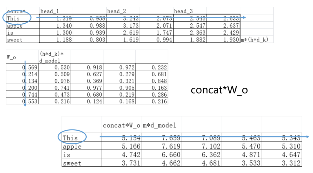 现在相当于把通过多个“镜片”看到的信息“拼接”到一起了,要使得它们“融合”,就再加一层线性变换W_o(记住乘以参数矩阵就等于“让模型自己学习怎么融合”)。