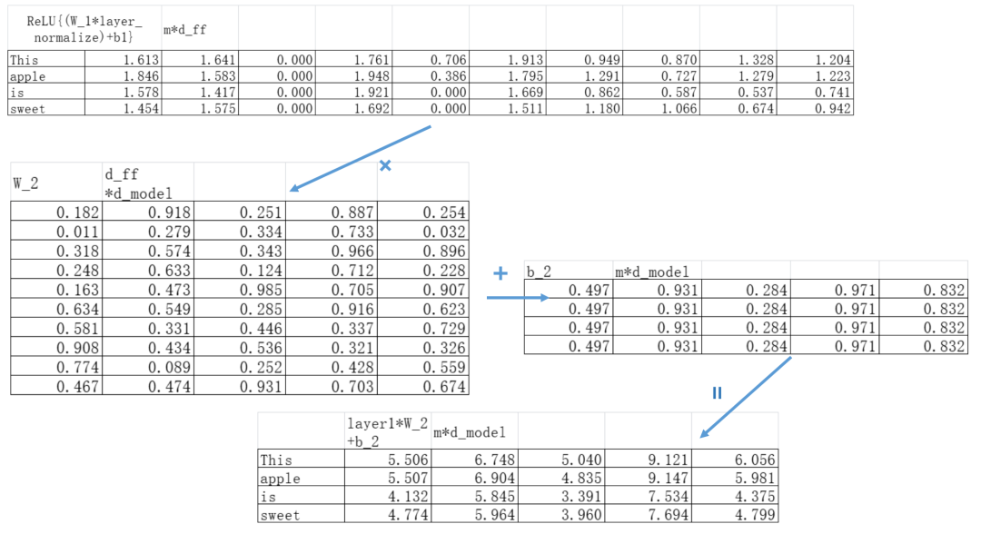 然后把这个经过了ReLU函数的矩阵放入第二个线性变换。第二个线性变换要把embedding矩阵的维度恢复,第二个线性变换W_2的形状为d_ff*d_model。经过第二层变换的矩阵形状为m*d_model。