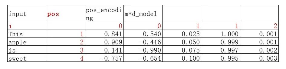 回到“This apple is sweet”这个例子,位置编码是怎么样的呢?