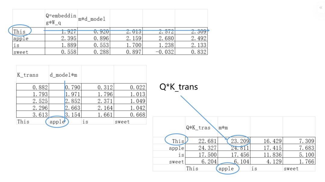 在我们这个Transformer的例子里面,每个行向量代表一个信息,把Q矩阵与K矩阵的转置相乘,就是把任意token两两之间的Quries和Keys做相似度比较,看下每个token需要的信息在谁那里。