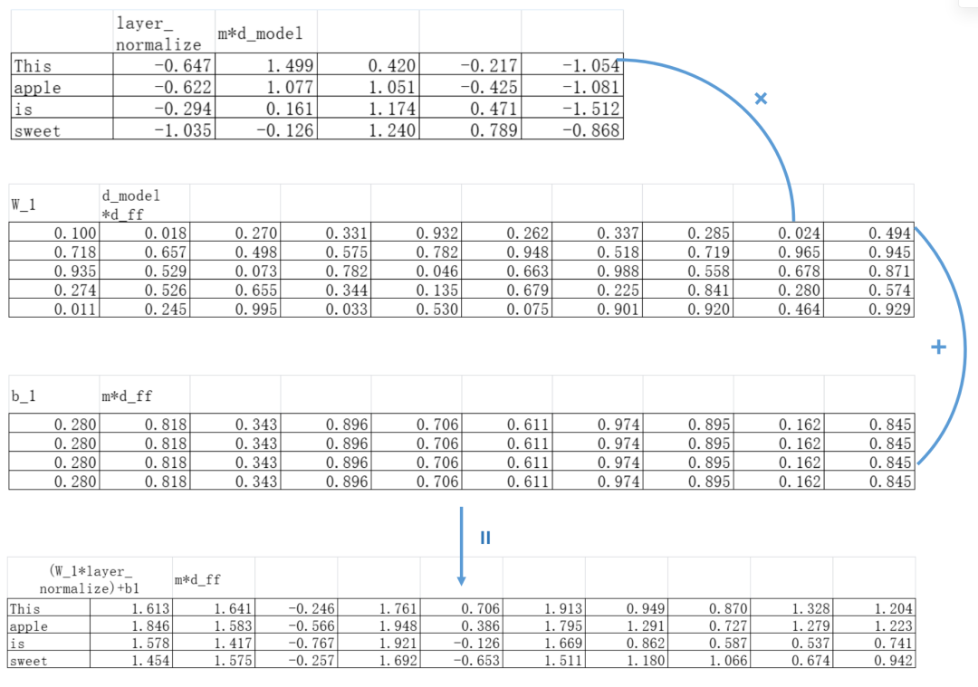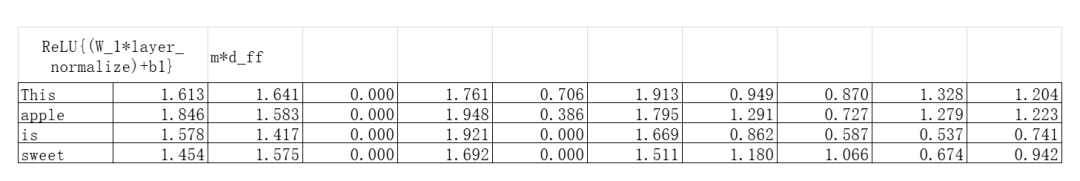 回到我们“This apple is sweet”的例子。我们原始的token embedding维度为5,假设用前馈神经网络先扩展到10维(d_ff=10),然后再回到5维。