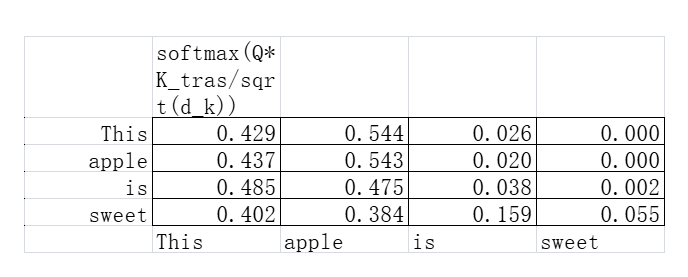 我们现在得到了Q*K_trans矩阵,由于要把信息按照“相关性得分”加权平均,需要使用一个Softmax函数来把这一堆“点积数值”给转化为“0-1之间”并且“和”为1的权重值。