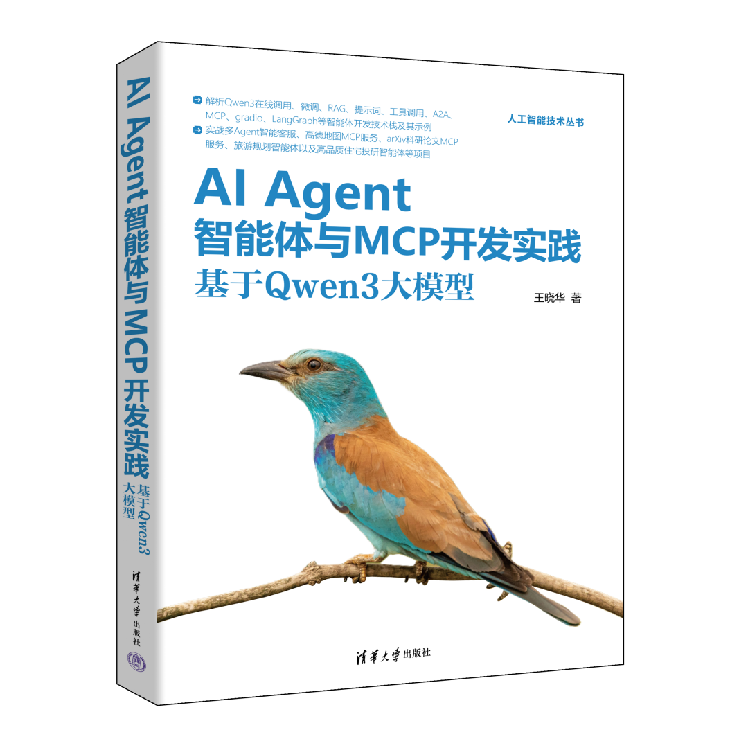 《AI Agent智能体与MCP开发实践:基于Qwen3大模型》共分16章,内容包括从大语言模型到智能体的演进、Agent开发环境配置、二次元风格的陪伴Agent微调、在线Qwen3大模型的基本使用、RAG与提示工程、Agent架构设计、基于RAG的分层Agent智能客服实战、多Agent协作的原生A2A协议详解、MCP协议与应用详解、云上MCP服务的部署与使用、高德地图MCP服务智能调用实战、构建个性化的arXiv科研论文MCP服务、基于gradio的云上MCP服务发布、基于MCP的旅游规划智能体实战、多智能体框架LangGraph、基于LangGraph的高品质住宅投研智能体实战。
