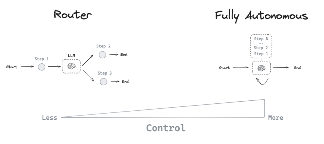 - 低自主程度:Agent 不具备循环迭代的能力,就像是一个 Router(路由器),一次只对一个任务(一个数据包)执行负责(路由决策分类)。后续需要人类自己根据输出调整下一次输入。典型如上文中提到的 Function Call Agent。