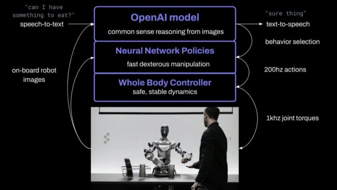 顶层接入 OpenAI 的多模态大模型,提供视觉推理和语言理解;中间层神经网络策略作为小脑进行运动控制并生成动作指令;底层机器人本体接受神经网络策略的动作指令,进行控制执行。