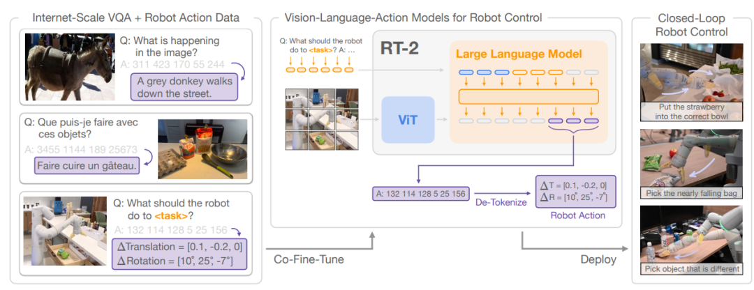 GoogleRT-2首先在大规模互联网数据预训练视觉语言模型,学习到语言和视觉信息之间的关联和模式;然后在机器人任务上微调,结合机器人动作数据,推出视觉语言动作模型。