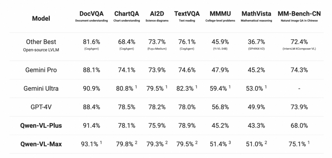 凭证审核的主要任务集中在视觉问答(Visual Question Answering, VQA)上。结合 Qwen 官网对相关模型的 VQA 任务测评(如下图所示)以及我们对相关任务的实际测评,初步判断具备可行性。