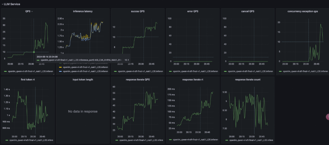 为了摸清微调后大模型服务的 QPS 水位,我们对模型进行了压测。在双卡 L20,单张图片并且输入输出 tokens 与微调时保持一致的情况下,大概能达到 10QPS 水准,达到我们的业务场景要求。