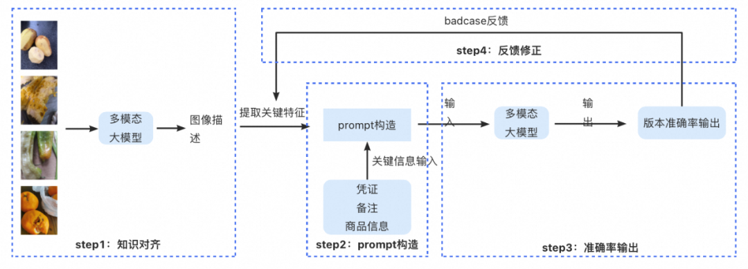为快速对数百个叶子类目进行优化,我们设计了一套 prompt 调优工程化的方案,根据该调优方案,我们覆盖了发霉、腐烂、脏污、破损、掉粒等 20 + 种场景的识别检测。该方案主要有如下四个环节: