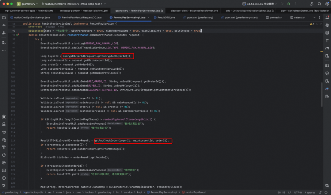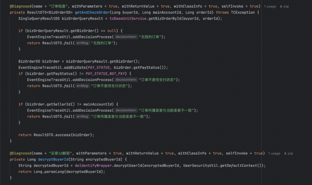 如下图,对两个私有方法 decryptBuyerId 和 getAndCheckOrder 加上 @Diagnosed 注解。