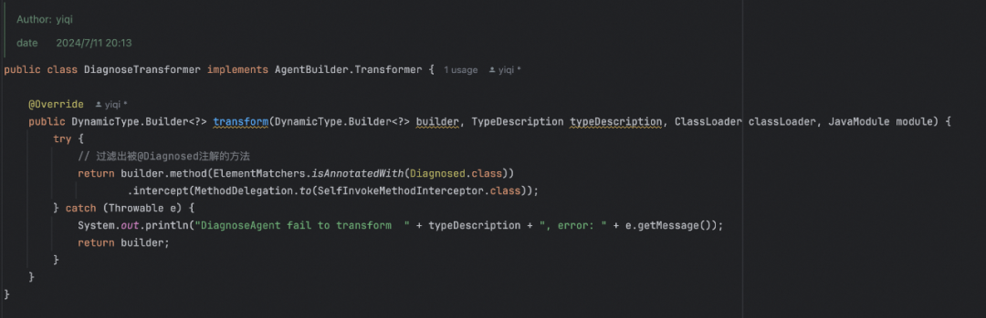 DiagnoseTransformer 需要再对方法进行一次过滤,匹配带有 @Diagnosed 注解的方法,并通过.intercept 进行方法执行的委托。我这里定义了一个 SelfInvokeMethodInterceptor,并将方法的执行委托给它。